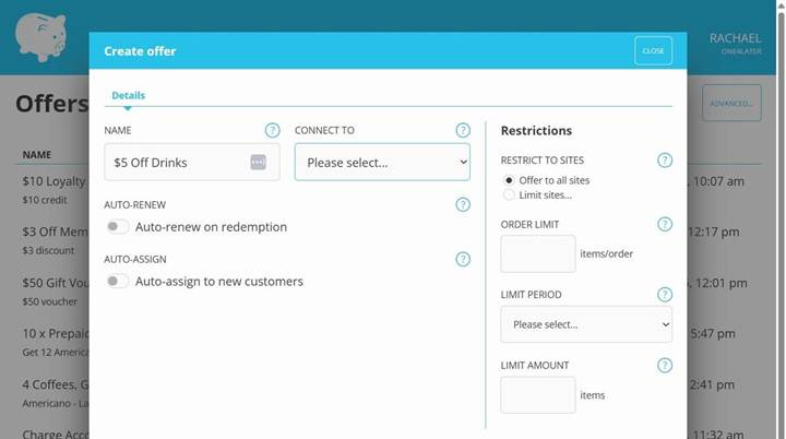 - Type the name of your offer. In the example we have used "$5 Off Drinks".