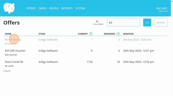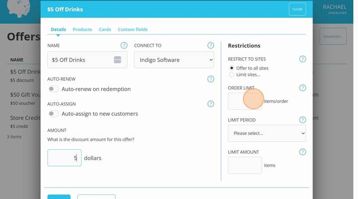 - Search for your offer to include restrictions. In the example here the $5 off Drinks offer is being used.